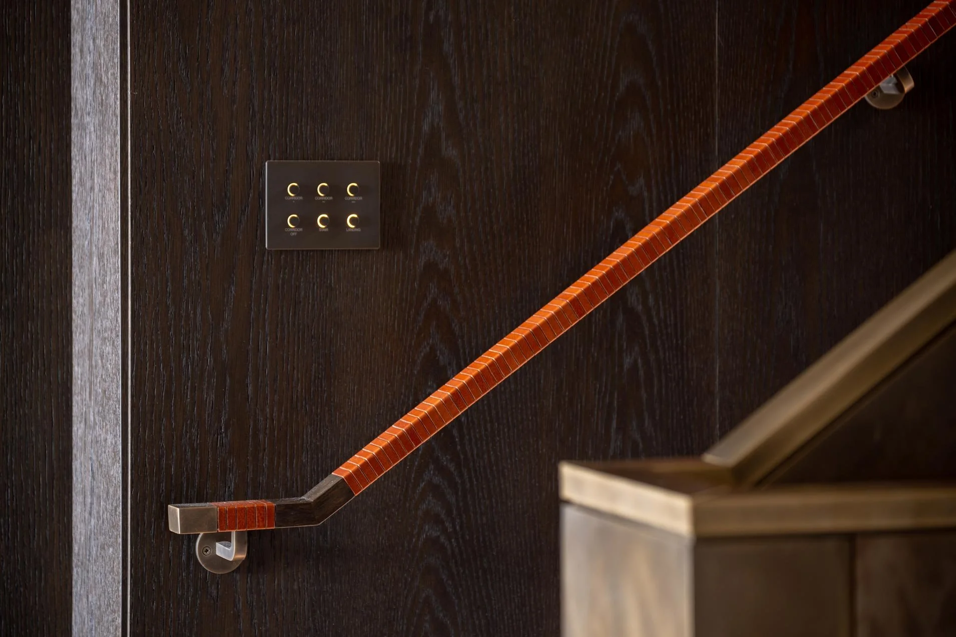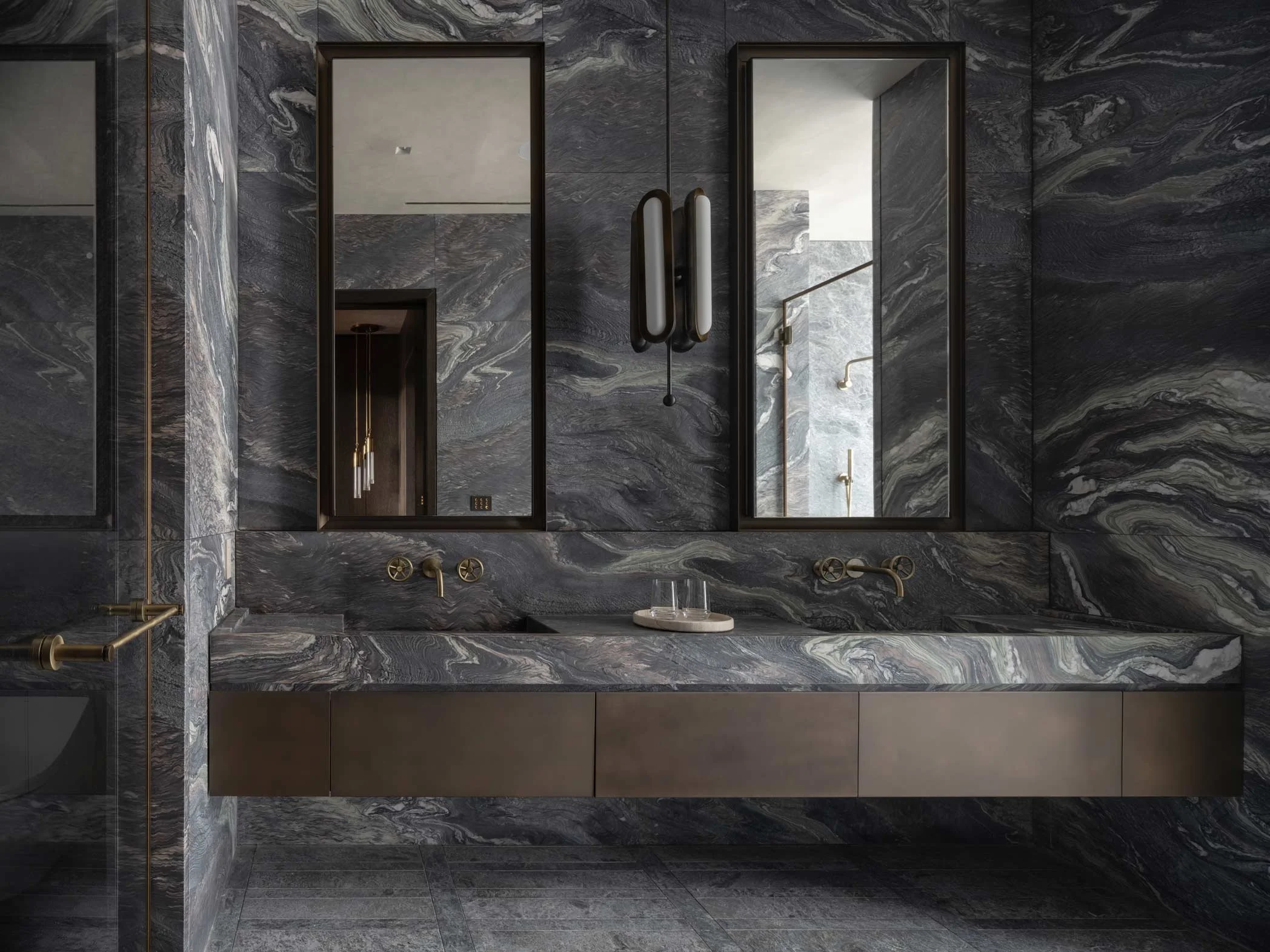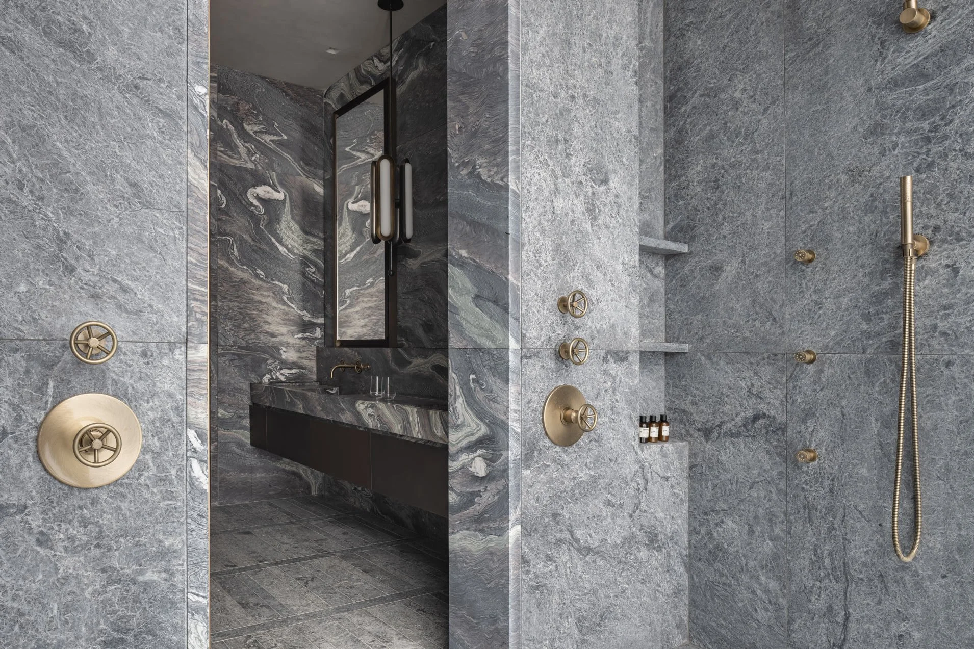 The interior features sophisticated sand-blasted oiled wood and Canadian soapstone, accented by tactile quartzites, rich suedes, and custom carpets, each area telling its own story.